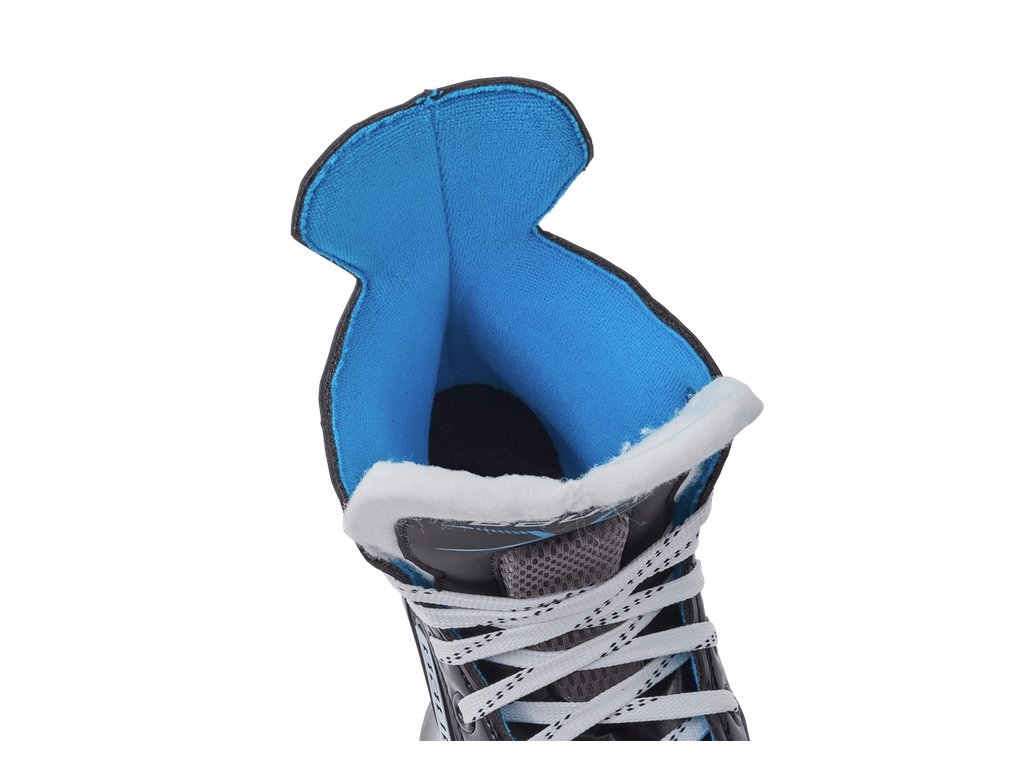 Anatomicky tvarovaný dvojdielný plstený jazyk ľahkej konštrukcie svonkajším chráničom priehlavku, ktorý chráni nohu pred nárazom puku.